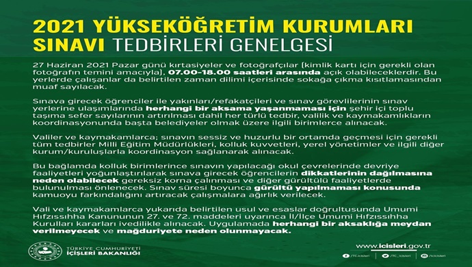 Kaynak:https://www.icisleri.gov.tr/bakanligimiz-81-il-valiligine-2021-yuksekogretim-kurumlari-sinavi-tedbirleri-konulu-genelge-gonderdi