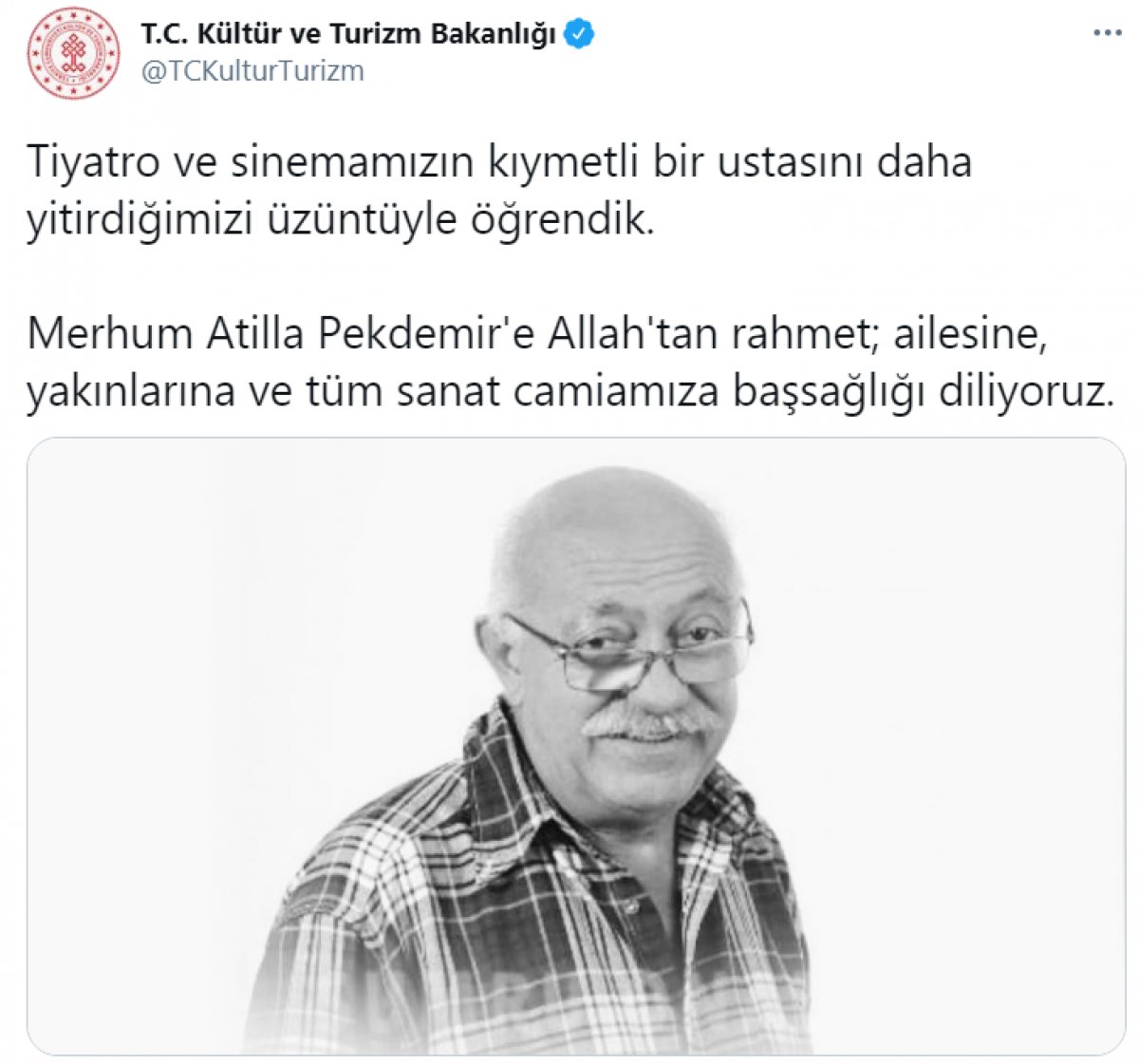Kültür ve Turizm Bakanlığı’nın Twitter hesabından yapılan paylaşımda, “Tiyatro ve sinemamızın kıymetli bir ustasını daha yitirdiğimizi üzüntüyle öğrendik. Merhum Atilla Pekdemir’e Allah’tan rahmet; ailesine, yakınlarına ve tüm sanat camiamıza başsağlığı diliyoruz.” denildi.
